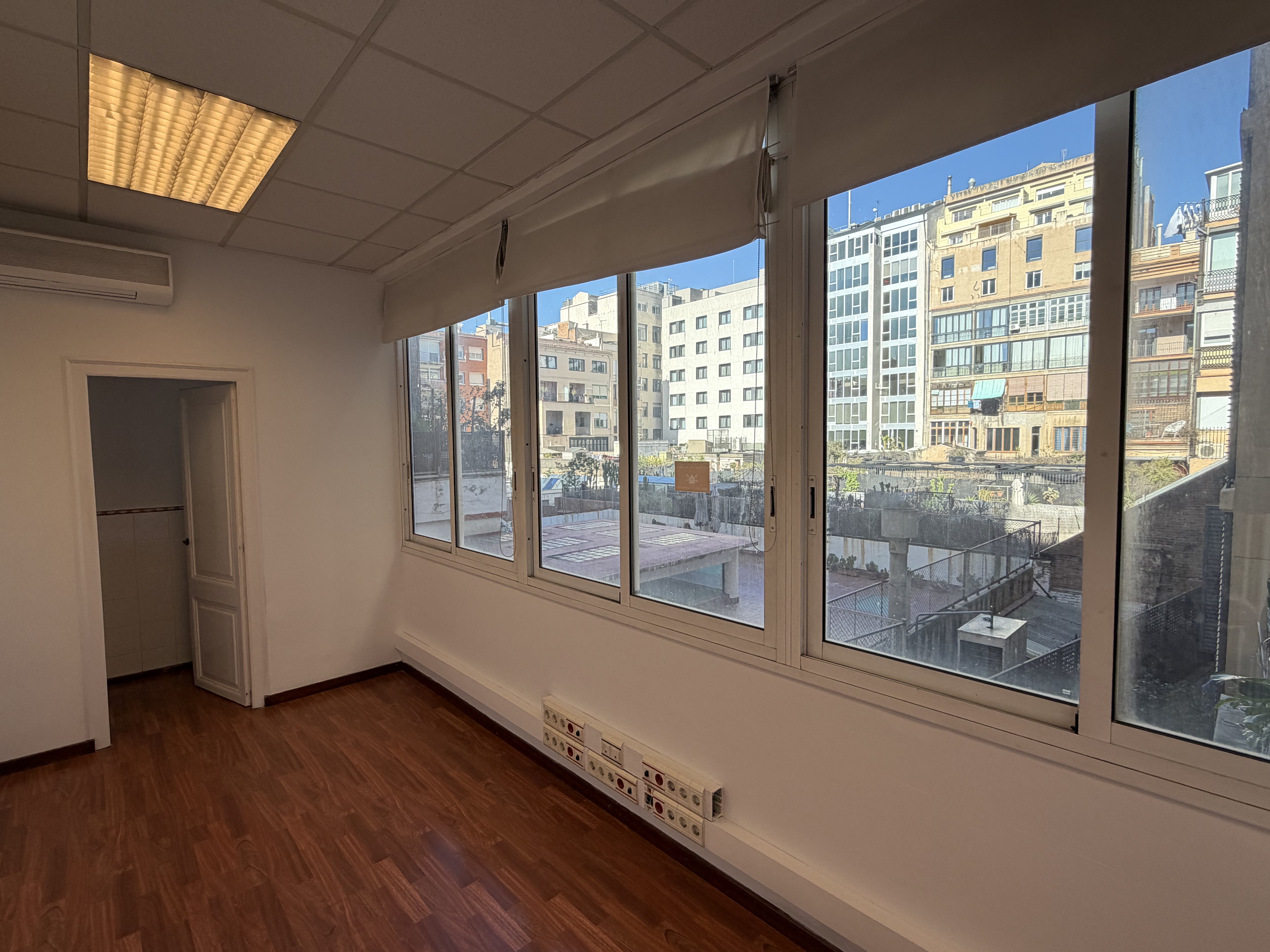 Oficina de 125 m2, distribuido en varios despachos con balcones a calle Casp y vistas al centro de l’Illa central, techos altos, con dos grandes salas y 3 despachos, dispone de 2 aseos, red informática, instalación eléctrica, etc.
